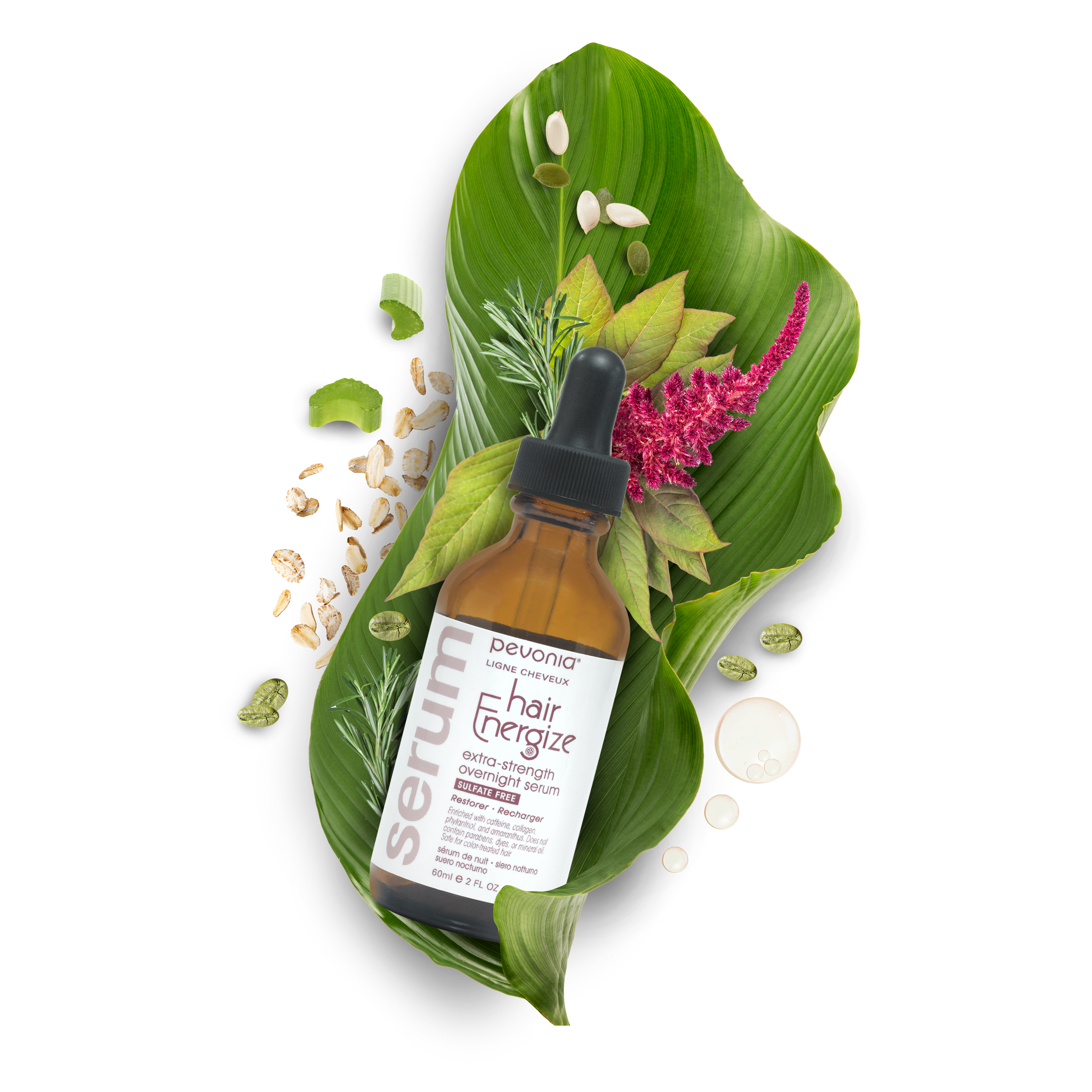 Ferment Extract, Phytantriol, Caffeine,  Maltodextrin, Xanthan Gum, Hydroxyethylcellulose,  Caprylic/Capric Triglyceride, Apium Graveolens (Celery) Root/Seed Extract Dimethyl Isosorbide, Sesamum Indicum (Sesame) Seed Oil, Tocopherol (Vit. E)  Serenoa Serrulata Fruit Extract, Collagen, Panthenol, Amaranthus Caudatus Seed Extract, Propanediol, Biotin, Keratin, Camellia Sinensis Leaf Extract, Chamomilla Recutita (Matricaria) Flower Extract, Urtica Dioica (Nettle) Extract, Cucurbita Pepo (Pumpkin) Fruit Extract, Glycerin, Rosmarinus